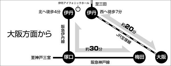-JR大阪駅(福知山/宝塚線)-(普通列車約20分)-JR伊丹駅下車(快速も停車します)