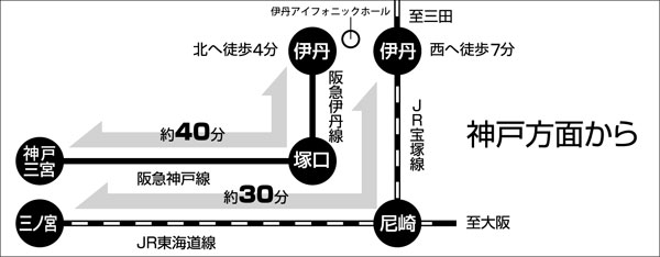 阪急神戸三宮駅(神戸線)-(約30分)-阪急塚口駅(伊丹線)-(約10分)-阪急伊丹駅下車